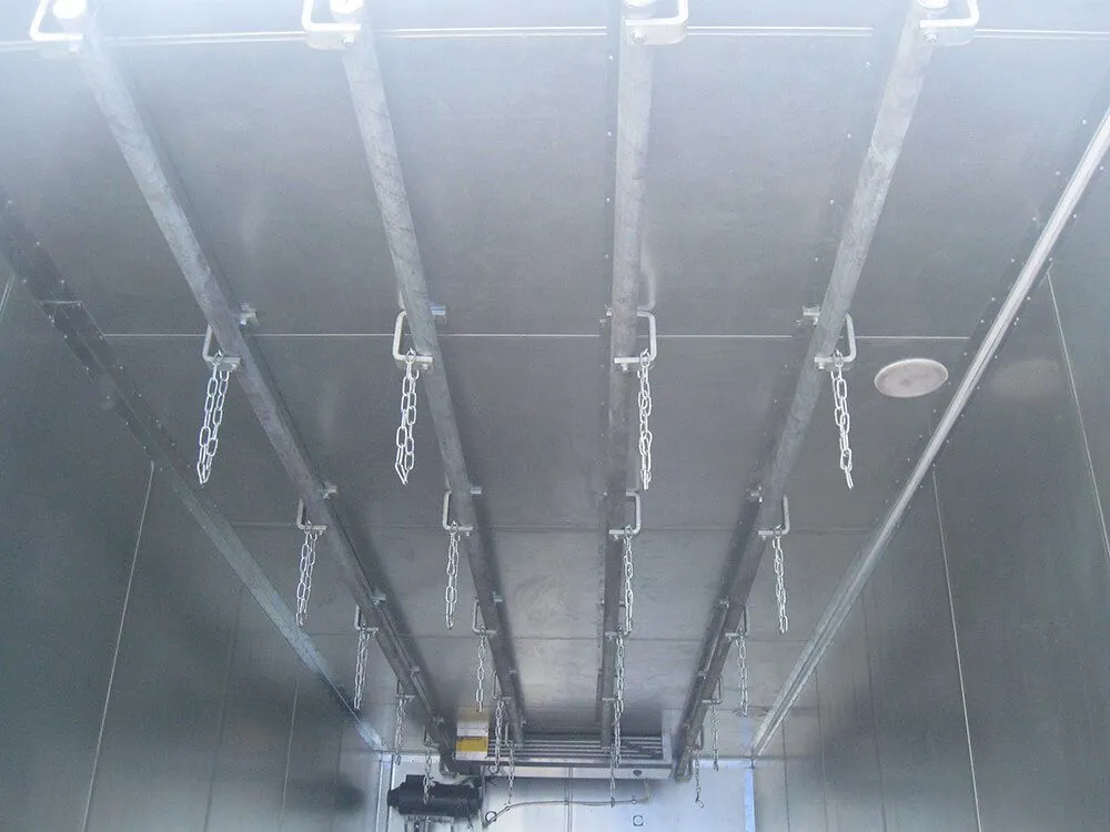 На потолке внутри фургона установлены трубчатые направляющие для крюков с допустимой нагрузкой на крюк –200 кг. Допустимая нагрузка на потолок – 2/3 от грузоподъёмности на пол. Количество направляющих от 3 до 5.